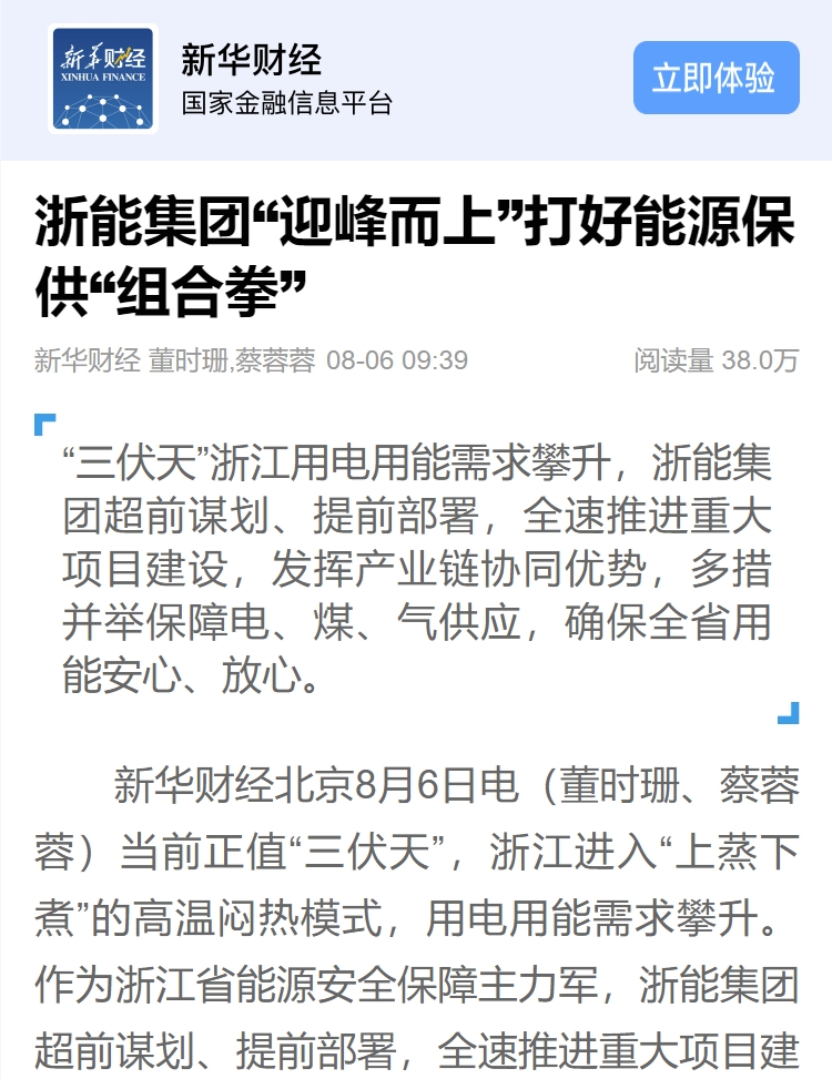 日前,新華社刊登報道《打好迎峰度夏“組合拳” 浙能集團持續(xù)提升能源保供能力》,截至目前文章點擊量破百萬。