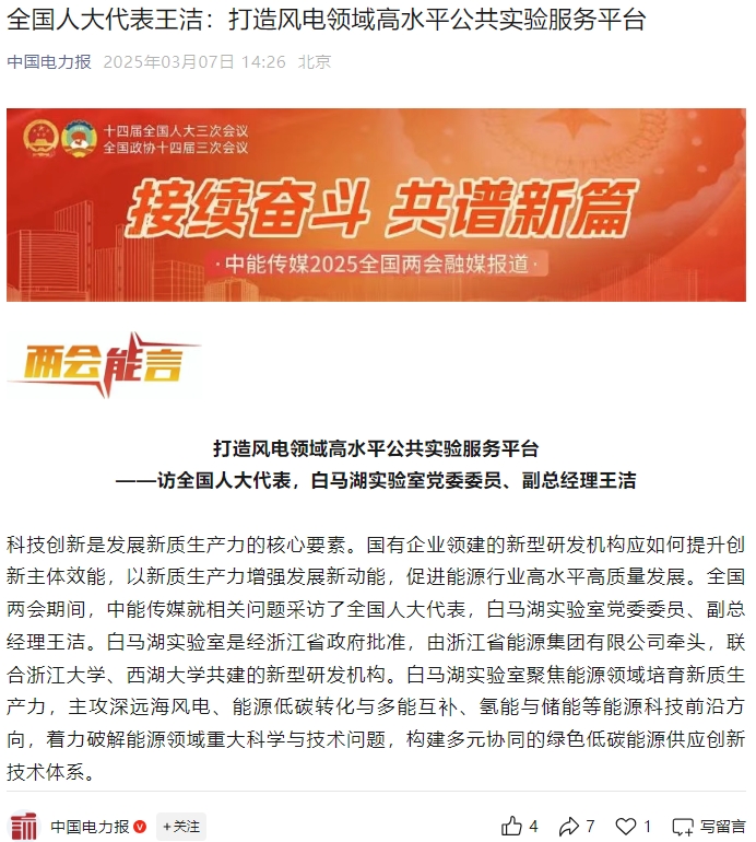 《中國電力報》微信公眾號報道《全國人大代表王潔:打造風電領(lǐng)域高水平公共實驗服務平臺》。 中國電力報微信公眾號 圖