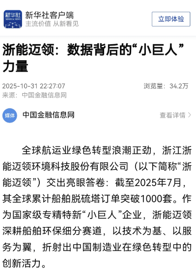 全球航運(yùn)業(yè)綠色轉(zhuǎn)型浪潮正勁,浙江浙能邁領(lǐng)環(huán)境科技股份有限公司(以下簡稱“浙能邁領(lǐng)”)交出亮眼答卷:截至2025年7月,其全球累計(jì)船舶脫硫塔訂單突破1000套。作為國家級專精特新“小巨人”企業(yè),浙能邁領(lǐng)深耕船舶環(huán)保細(xì)分賽道,以技術(shù)為基、以服務(wù)為翼,折射出中國制造業(yè)在綠色轉(zhuǎn)型中的創(chuàng)新活力。