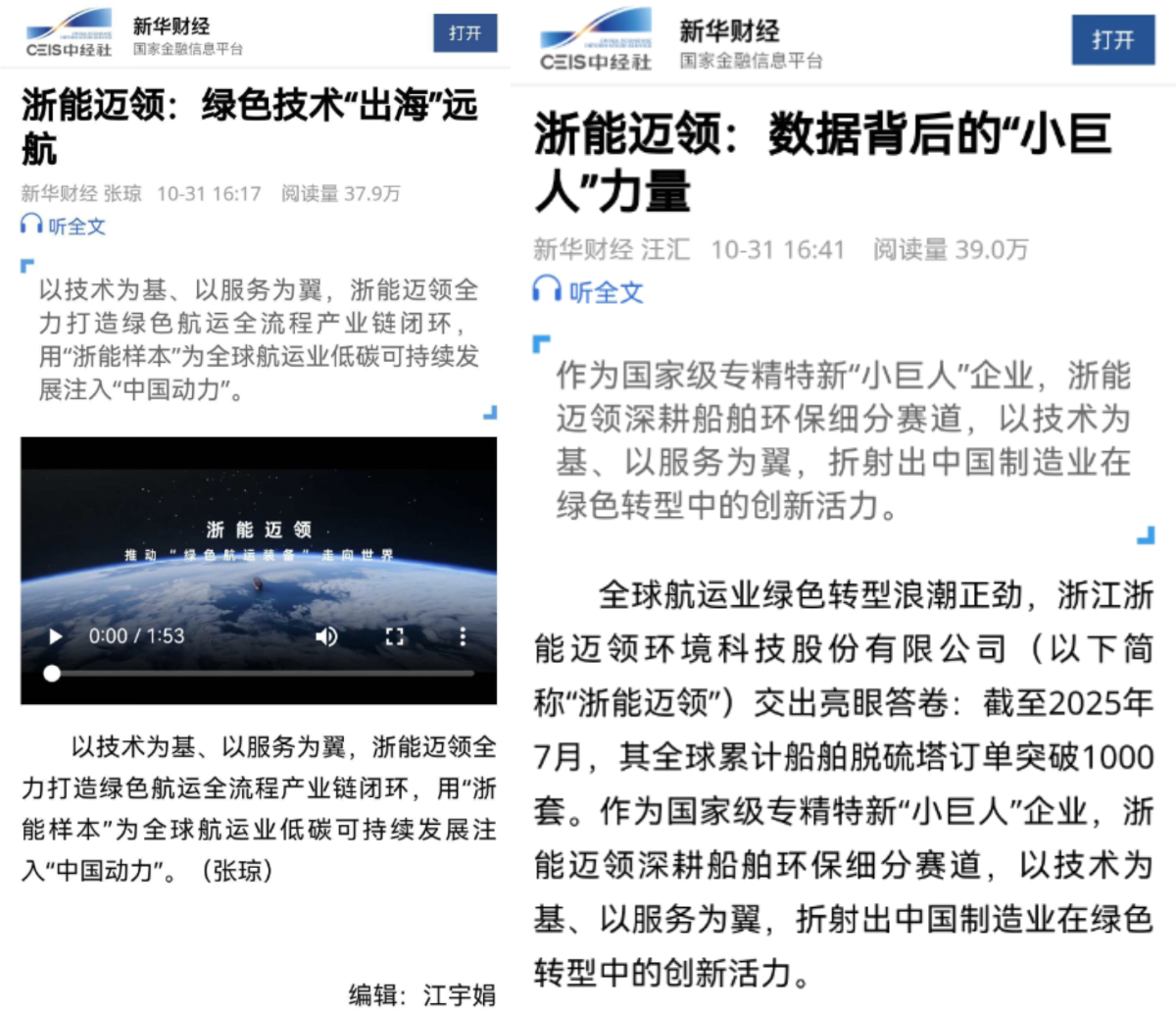 近日,新華社快看視頻號、新華社客戶端、新華財(cái)經(jīng)客戶端等平臺聚焦報(bào)道浙能邁領(lǐng)以技術(shù)為基、以服務(wù)為翼,全力打造綠色航運(yùn)全流程產(chǎn)業(yè)鏈閉環(huán)的實(shí)踐與成就。