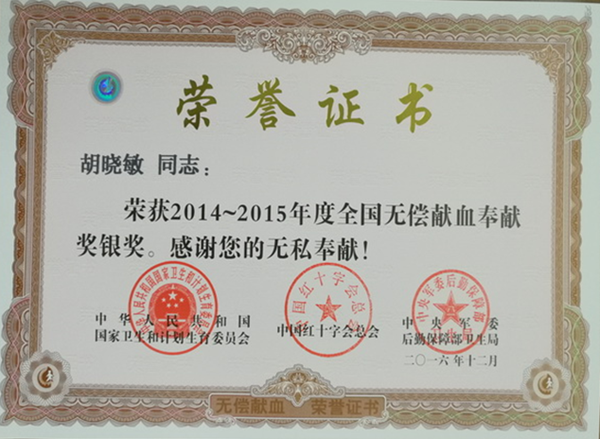 近日,溫州發(fā)電公司員工胡曉敏獲全國無償獻(xiàn)血奉獻(xiàn)銀獎,這是他第2次獲得“全國無償獻(xiàn)血奉獻(xiàn)銀獎”殊榮,也是對他多年來長期堅持無償獻(xiàn)血,關(guān)心公益事業(yè)的肯定與褒獎。
