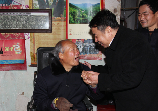 從項艷飛家中出來后,張兆都一行驅車35公里來到長興縣白峴鄉(xiāng)和岕口村嶺上自然村,走訪慰問居住在這里的退休職工章長福。章長福曾獲煤炭部勞模稱號,退休后因患腦溢血,生活不能自理。張兆都一進章長福家門,就握著老章和他老伴的手,噓寒問暖。在老章家簡陋的小屋里,張兆都和老章親切交談。當?shù)弥险履贻p時擔任礦井采煤隊長,勇奪高產作貢獻的事跡時,張兆都向老章伸出大拇指,連聲稱贊:“你為長廣的建設發(fā)展作出了貢獻,組織上不會忘記。今天,省總工會、浙能集團工會、長廣集團領導都來看望你,希望你生活愉快,安度晚年?!闭麻L福十分激動地說:“領導和組織時常關心、照顧著我,非常感謝?!?/p>