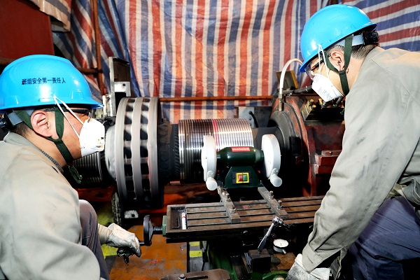 2月15日(大年三十),浙能嘉電公司檢修人員在對(duì)發(fā)電機(jī)轉(zhuǎn)子集電環(huán)進(jìn)行施工作業(yè)。 全國(guó)琴 攝
