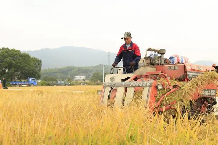 10月14日,浙能長廣集團煤山區(qū)域5號復墾地塊,農(nóng)戶正駕駛收割機割稻。