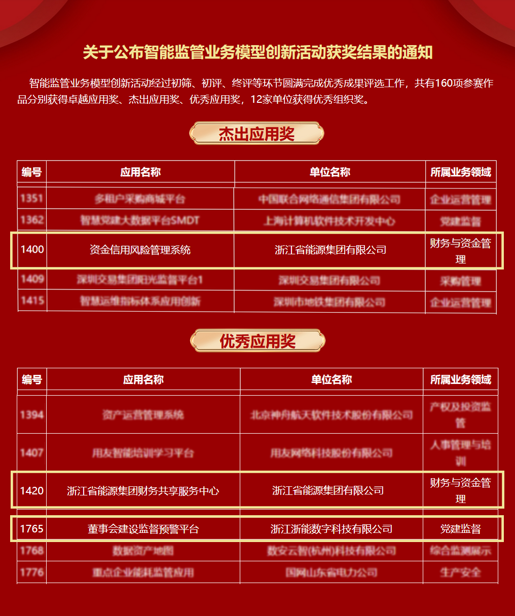 近日,國務(wù)院國資委2023年智能監(jiān)管業(yè)務(wù)模型創(chuàng)新活動獲獎名單揭曉,浙能集團(tuán)《資金信用風(fēng)險管理系統(tǒng)》榮獲“杰出應(yīng)用獎”,《財務(wù)共享服務(wù)中心》《董事會建設(shè)監(jiān)督預(yù)警平臺》榮獲“優(yōu)秀應(yīng)用獎”。
