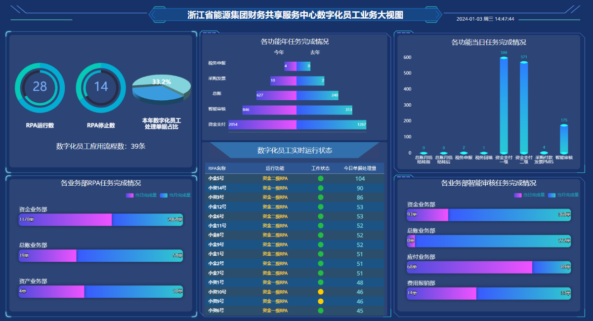 浙能財務(wù)共享運(yùn)營平臺上線以來已推廣21批線上運(yùn)行427家單位,開發(fā)129支標(biāo)準(zhǔn)化流程,與SAP等20個業(yè)財系統(tǒng)實現(xiàn)集成,覆蓋用戶3萬余人,從無到有打造以智能化、流程和數(shù)據(jù)驅(qū)動、業(yè)財稅資檔一體貫通、財務(wù)風(fēng)險控制和財務(wù)人才培養(yǎng)為主,富有浙能特色、不斷迭代升級、賦能價值創(chuàng)造的財務(wù)共享金名片,走在浙江國資國企前列。在數(shù)智化方面,該平臺采用統(tǒng)一架構(gòu)的端到端數(shù)字化平臺,利用IPA智能流程自動化、OCR智能審核、AI、NLP自然語言處理、全場景遠(yuǎn)程辦公等先進(jìn)技術(shù)手段,搭建起流程、審核、運(yùn)營和數(shù)治四個方面組成的智能應(yīng)用體系,實現(xiàn)憑證和支付自動化率雙雙超過99%,其中數(shù)字員工、數(shù)字化監(jiān)督看板、智能語音提單、智能派單、智能客服等一批功能應(yīng)用頗具特色、業(yè)內(nèi)領(lǐng)先,榮獲上國會“2022年智能財務(wù)最佳實踐年度綜合大獎”。