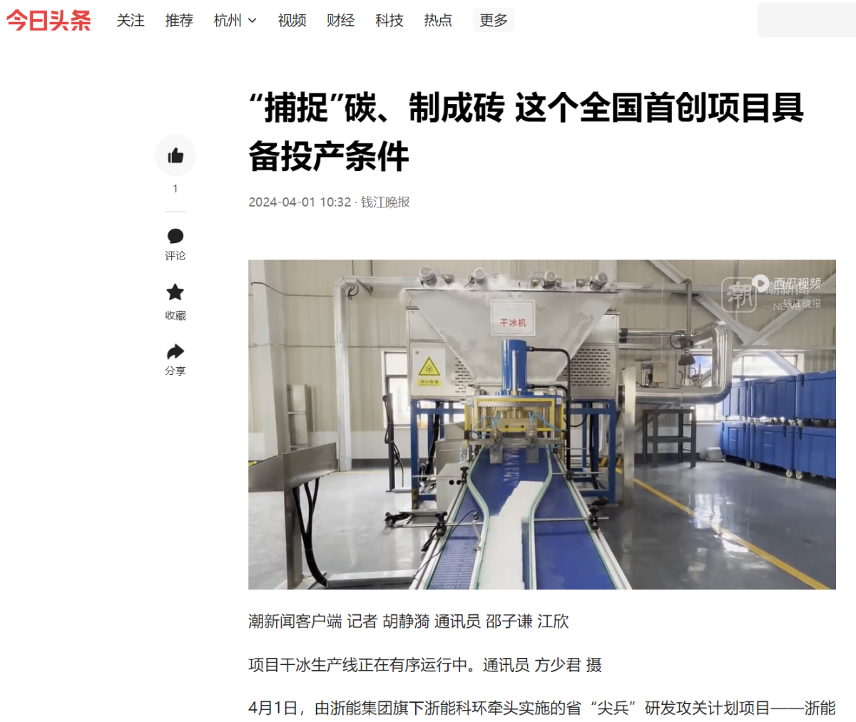 4月1日,今日頭條轉載報道《“捕捉”碳、制成磚 這個全國首創(chuàng)項目具備投產條件》。 今日頭條 圖