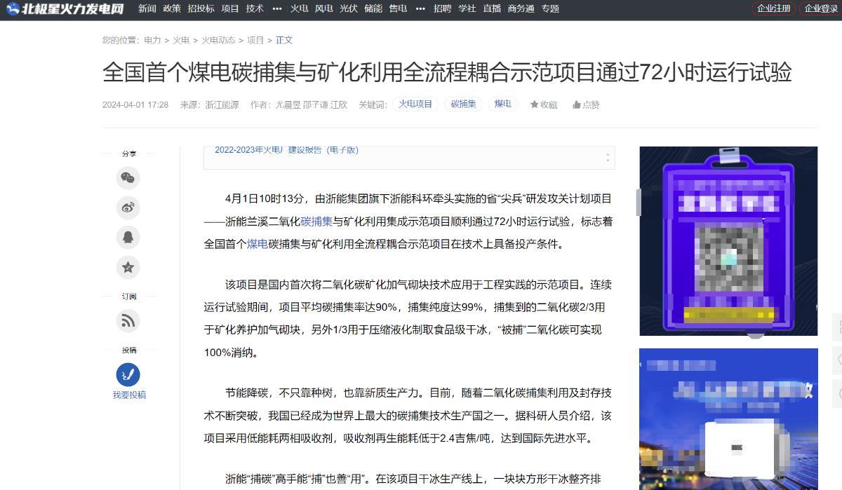 4月1日,北極星火力發(fā)電網轉載報道《全國首個煤電碳捕集與礦化利用全流程耦合示范項目通過72小時運行試驗》。 北極星火力發(fā)電網 圖